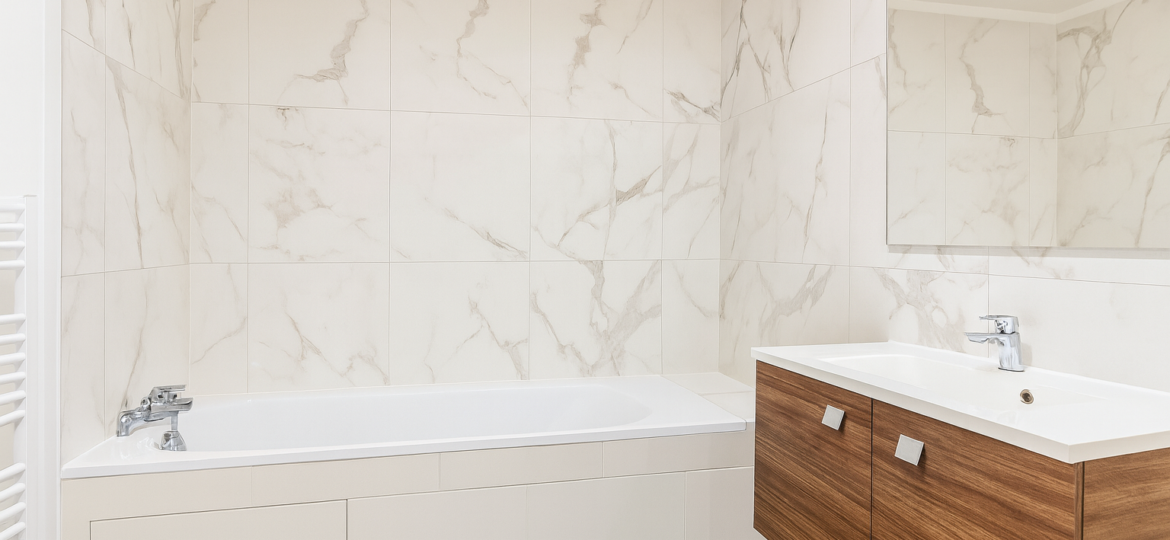 Salle de bains contemporaine, entièrement carrelée (sol et murs) avec WC