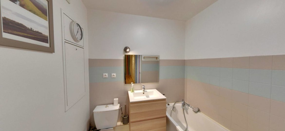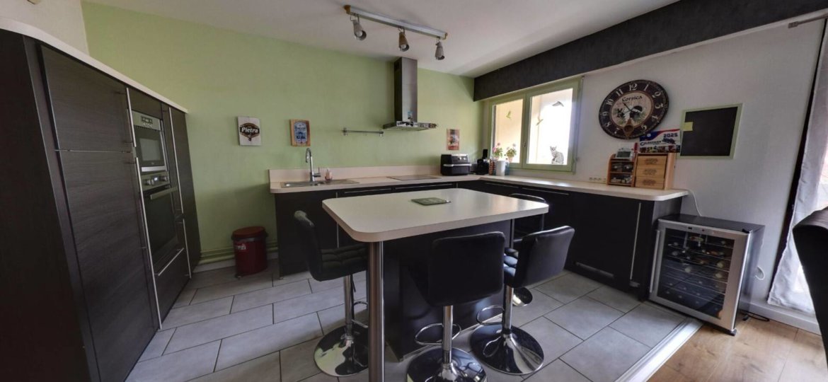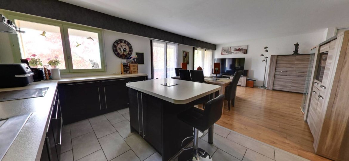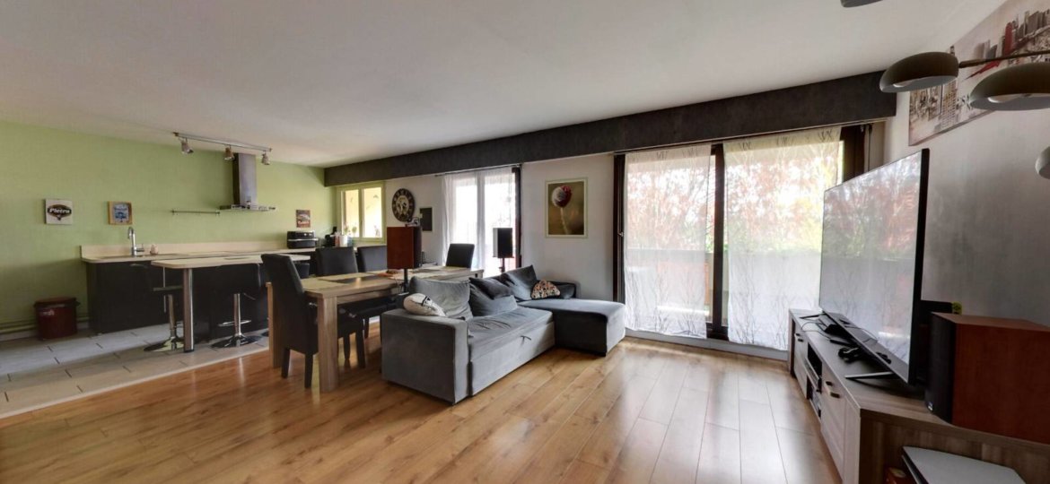 Il se compose d'une vaste entrée avec WC indépendant, d'une cuisine aménagée et équipée ouverte sur un séjour / salle à manger lumineux donnant accès à un balcon, ainsi que d'un espace bureau avec rangements sous l'escalier.