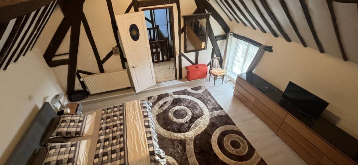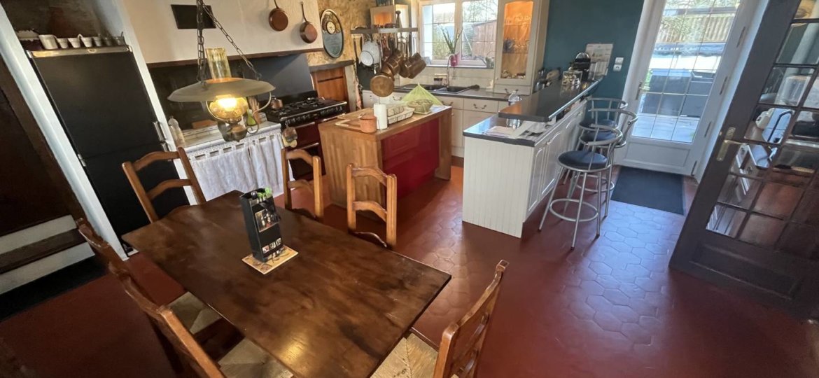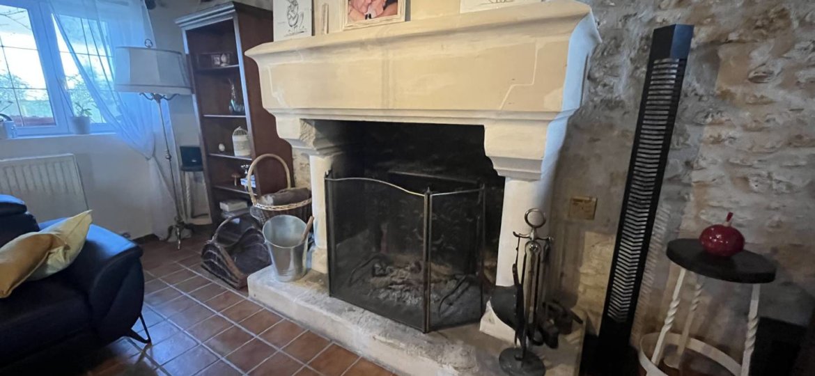Au rez de chaussée: entrée cathédrale, cuisine équipée (avec four à pizza et piano de cuisine, lave-vaisselle, réfrigérateur), WC, séjour-salon avec cheminée, cave.