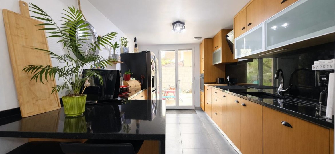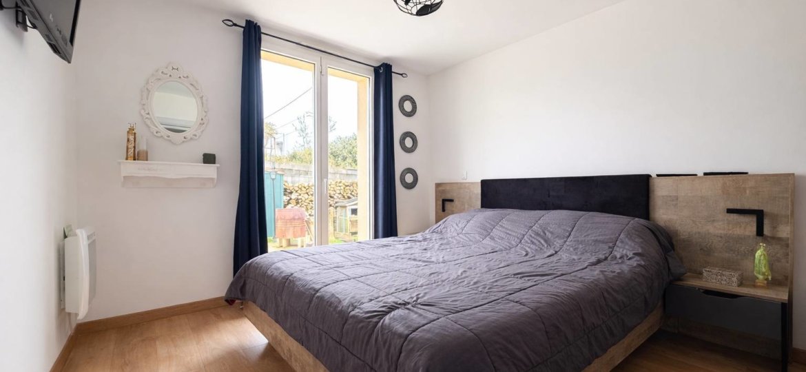 Au rez-de-chaussée : un séjour ouvrant sur une cuisine ouverte, une chambre, une salle de bain avec wc, une buanderie.