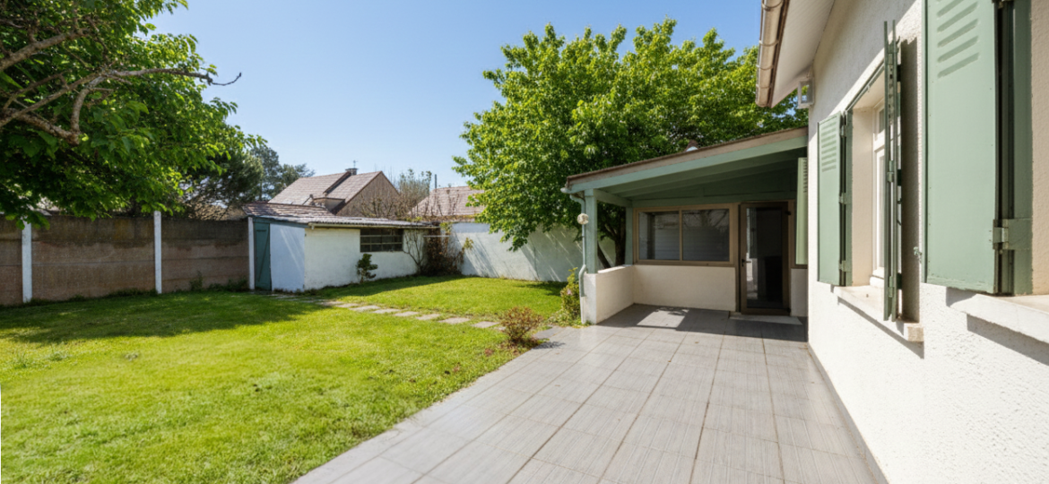 Jardin avec petite terrasse et abris de jardin.