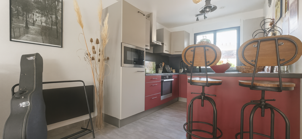 – Au rez-de-chaussée, vous trouverez une entrée, un bel espace de vie lumineux composé d’un salon séjour ouvert sur une cuisine moderne et équipée offrant un bel espace fonctionnel, placard, wc séparé