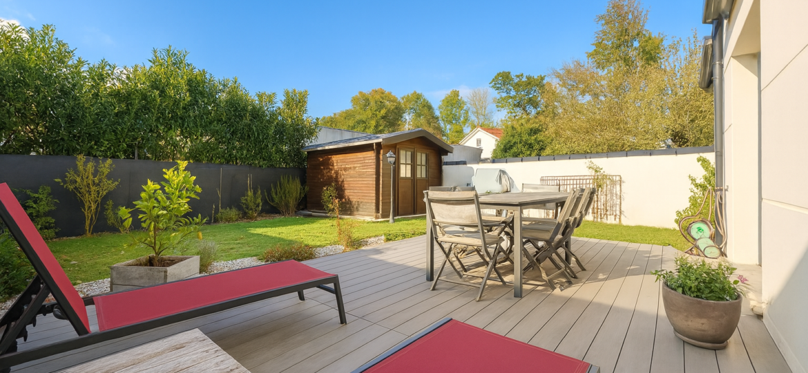 Le jardin soigneusement aménagé comprend une belle terrasse exposé plein OUEST, un abri de jardin