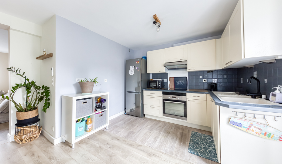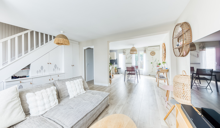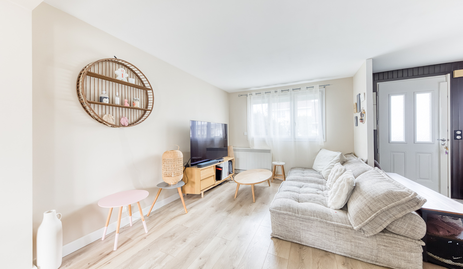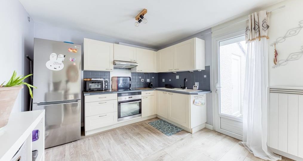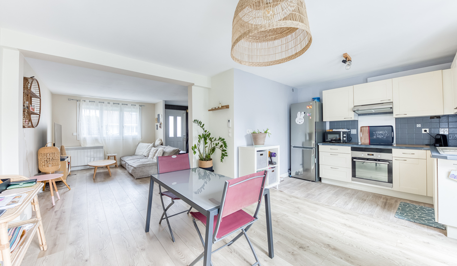 Maison, modèle "FLEURY V", mitoyenne que d'un coté, comprenant au Rez-de-chaussée : Entrée, Séjour double avec cuisine ouverte aménagée et équipée, WC indépendant. A l'étage (plancher béton) : palier, trois chambres non mansardées, Salle d'eau avec WC sanibroyeur, placards de rangement. Chauffage individuel électrique + Climatisation réversible. Maison lumineuse, parfaitement entretenue, à la décoration soignée, avec de nombreux travaux effectués : Huisseries PVC partout, volets roulants électrique au RDC, tableau électrique changé, ballon d'eau chaude neuf, nettoyage + peinture de la toiture. Le tout sur un jardin cocooning sans vis à vis avec un cellier attenant. Le plus : la maison dispose également d'un Box privatif et la possibilité de stationner plusieurs véhicules devant la maison.