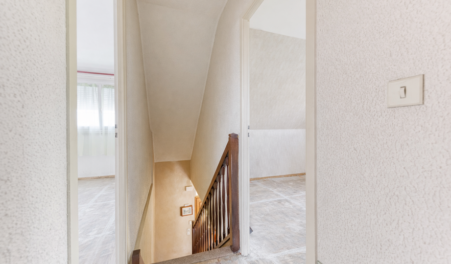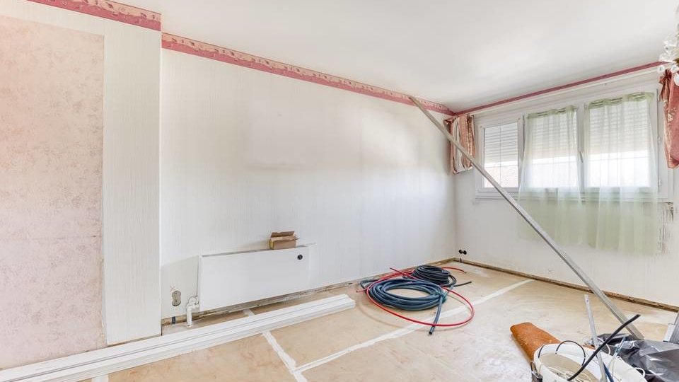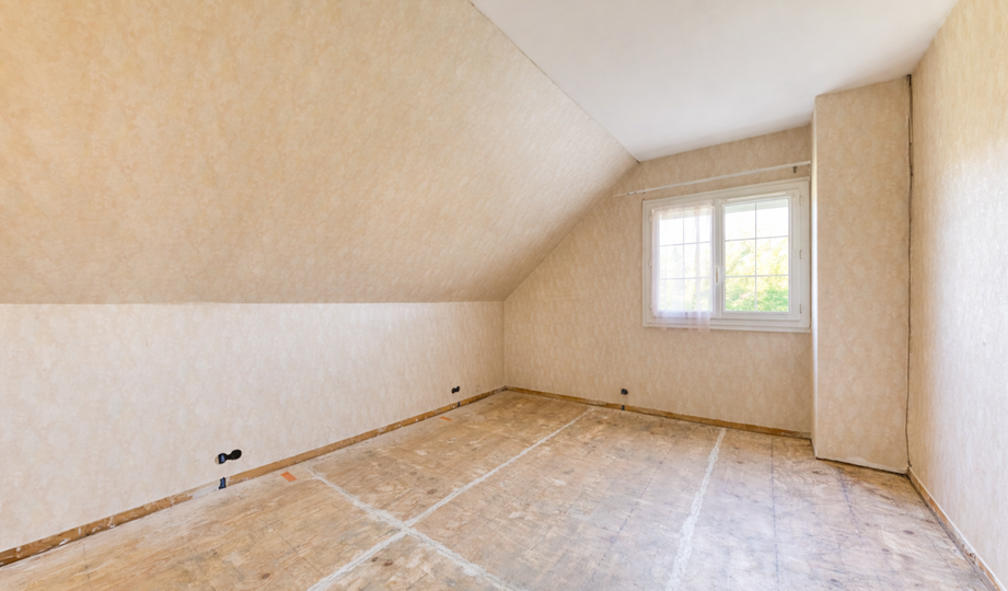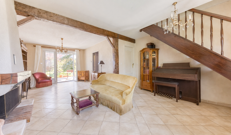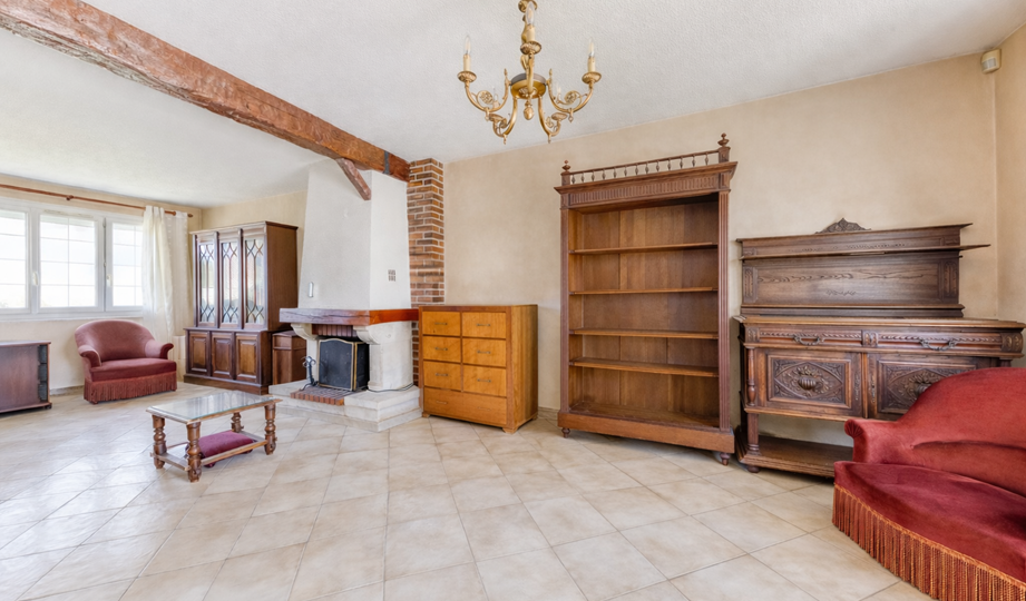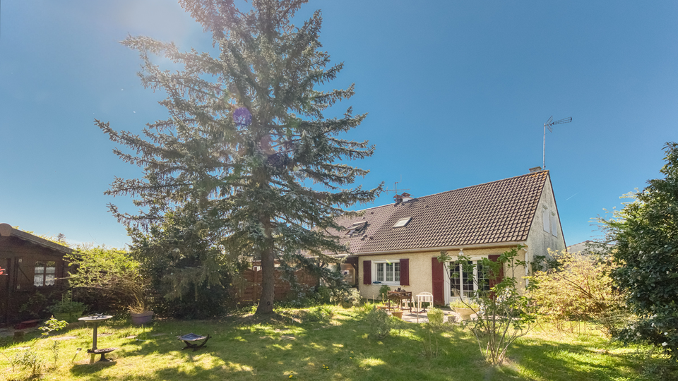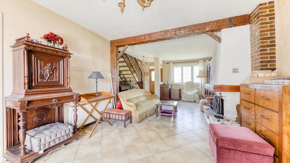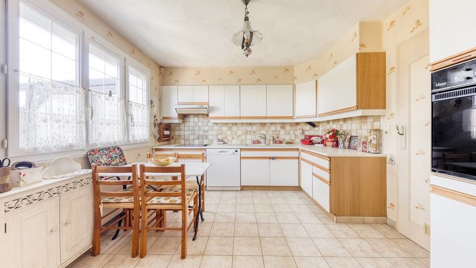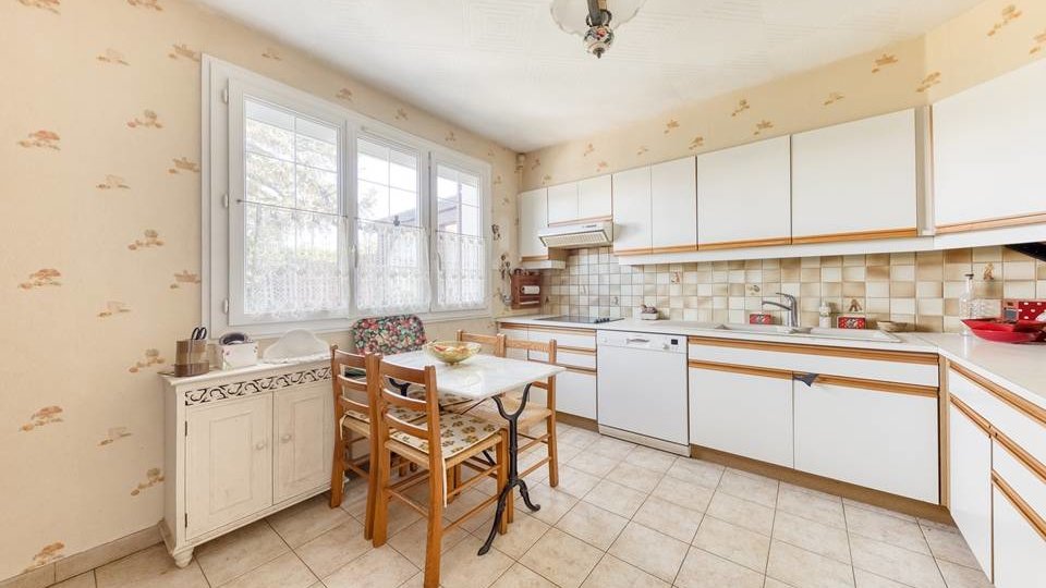 Maison, de type traditionnel, mitoyenne que d'un côté, modèle "PLESSIS V", d'une superficie de 99 m² habitables au sol (et 88 m² en Loi CARREZ), comprenant au Rez-de-chaussée : Entrée, beau Séjour double de + 33 m² avec cheminée ouverte, cuisine indépendante (possible US) aménagée et équipée, WC indépendant, dégagement, garage attenant. A l'étage : palier, trois chambres (12,06 m² / 12,90 m² au sol / 12,10 m² au sol), placards de rangement, dressing, Salle de bains avec WC. Chauffage individuel au Gaz de ville. Huisseries en PVC double vitrage partout + volets roulants électrique. TRAVAUX COMPLETS DE RAFRAICHISSEMENT ET MODERNISATION A PREVOIR. Le tout sur un très beau terrain d'une contenance totale de 389 m² avec un chalet en bois.