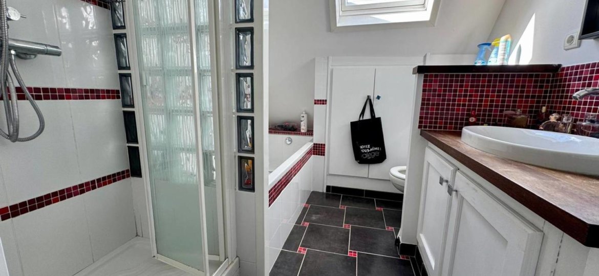 À l’étage, le dégagement dessert trois chambres avec placards, une seconde suite parentale avec salle d’eau, WC, dressing et accès à une terrasse privative, ainsi qu’une salle de bains équi
