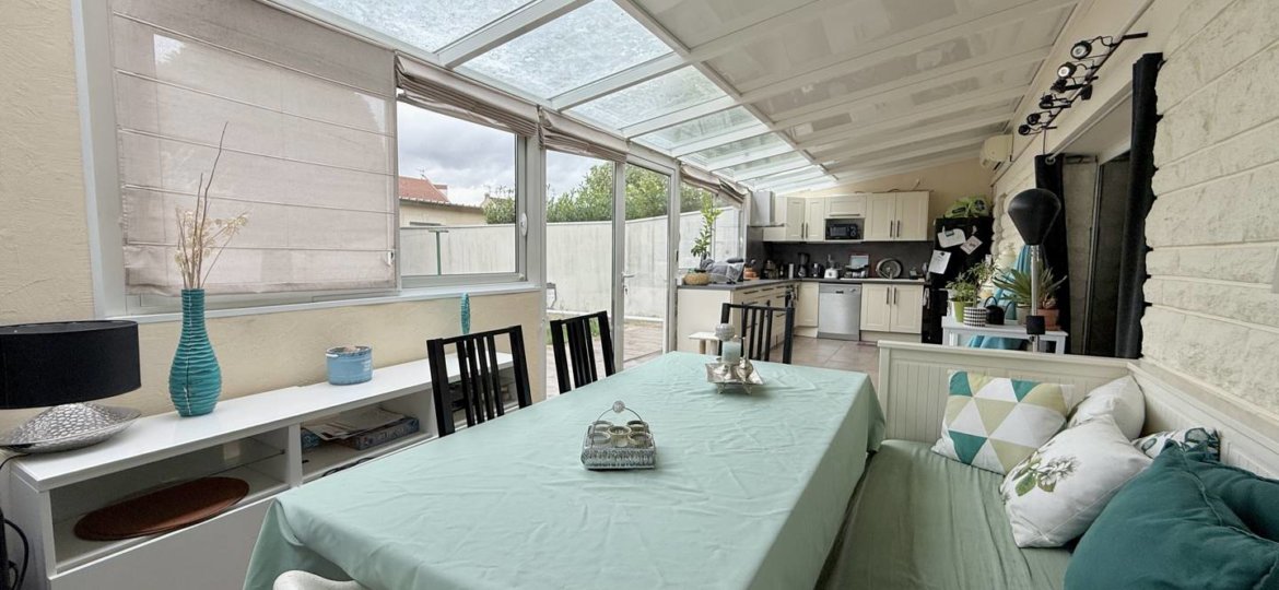 En rez-de-chaussée : spacieuse véranda aménagée en cuisine équipée et salle à manger, une chambre avec salle d'eau, wc, un bureau.