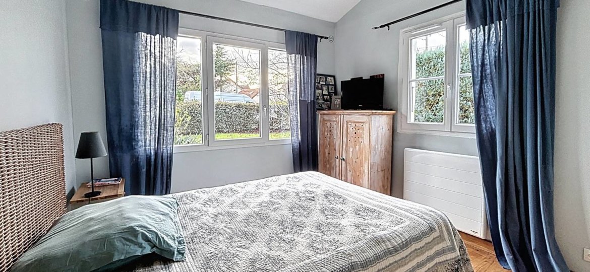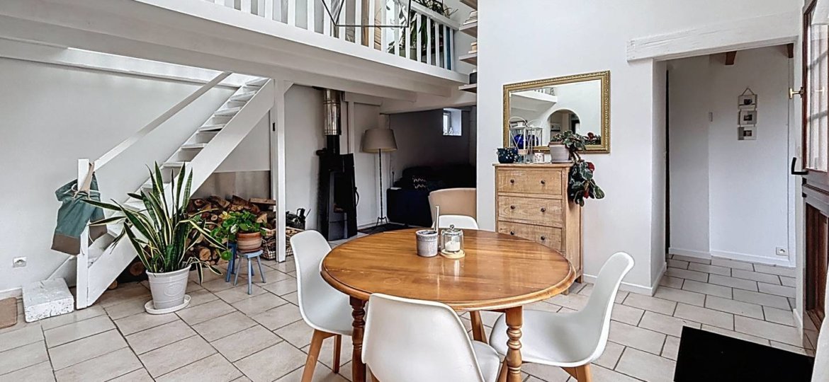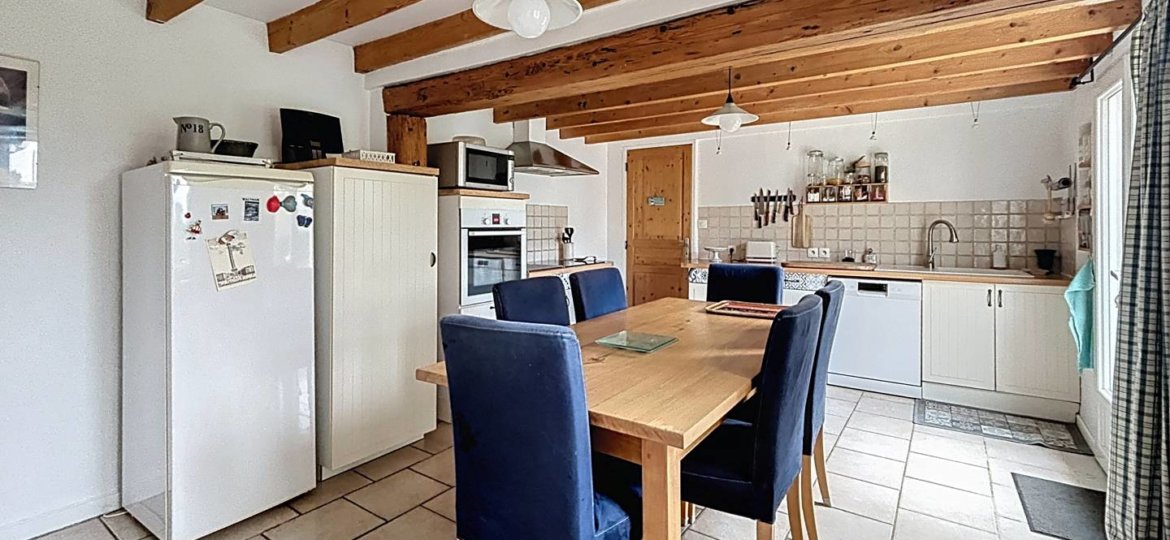 Au rez-de-chaussée, la maison offre une belle pièce de vie baignée de lumière, comprenant un coin salon cocooning avec poêle à bois, une spacieuse cuisine dinatoire de 20 m², ainsi qu'une buanderie de 11 m² avec rangements intégrés. Vous y trouverez également un wc indépendant, une chambre et une salle d'eau.