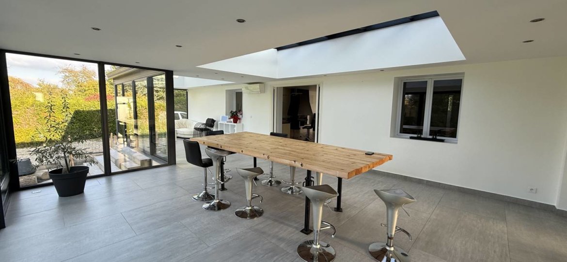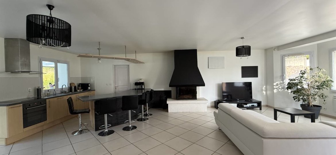 elle offre un séjour lumineux avec cheminée, cuisine ouverte équipée, véranda, 4 chambres dont une suite parentale avec salle d’eau et dressing, salle d’eau, WC.