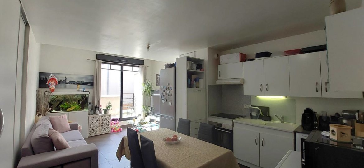 Il se compose d'une entrée, cuisine ouverte équipée avec plaque et hotte, chambre, salle de bains, wc séparé et séjour avec terrasse de 6,20 m² exposée S/E.