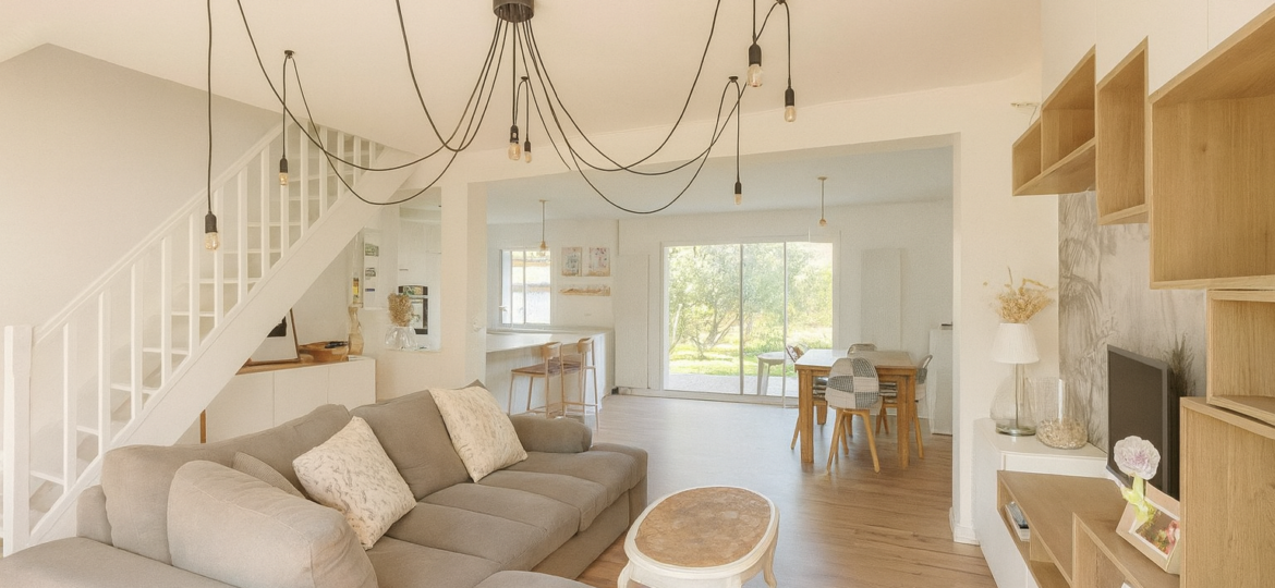 Un double séjour spacieux et traversant, baigné de lumière grâce à sa grande baie vitrée ouvrant sur la terrasse et le jardin exposés sud-ouest.