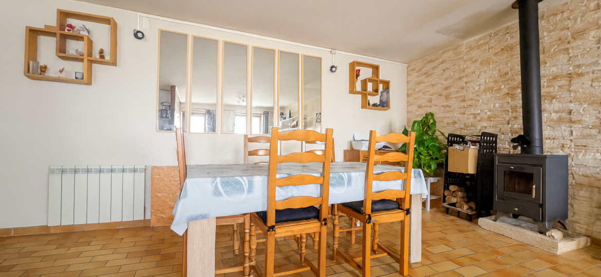 Vous serez séduit dès l’entrée par un salon séjour équipé d’un poêle à bois, ouvrant sur une cuisine aménagée et équipée
