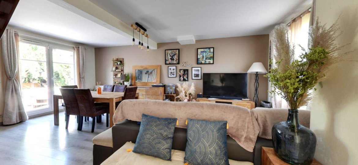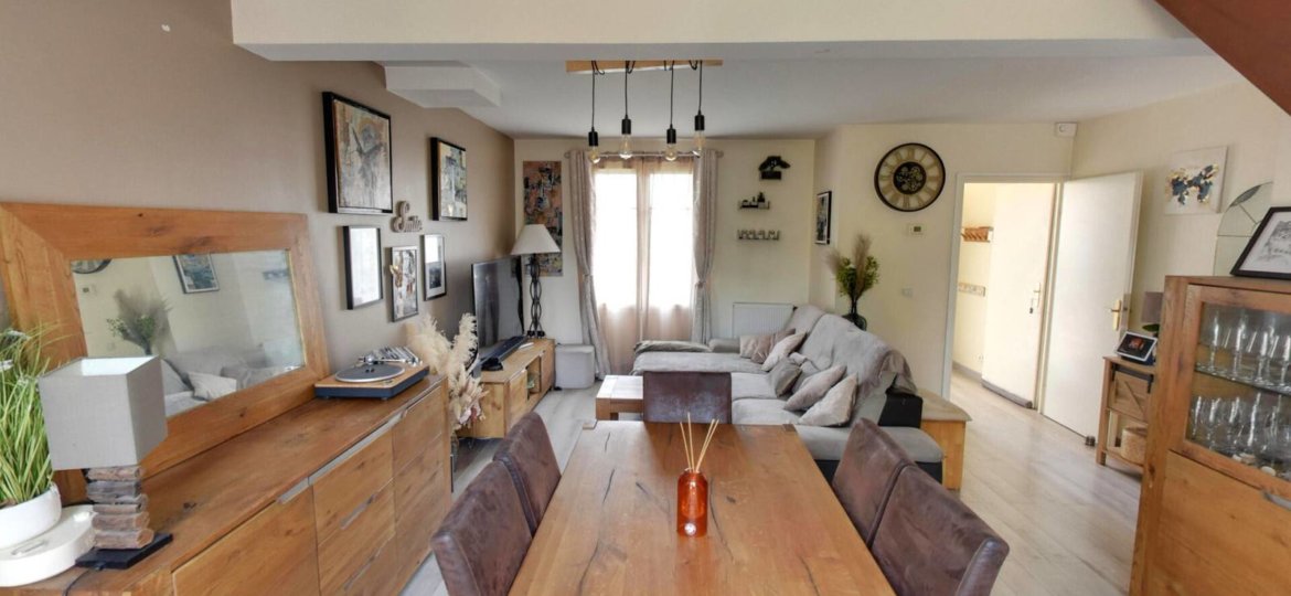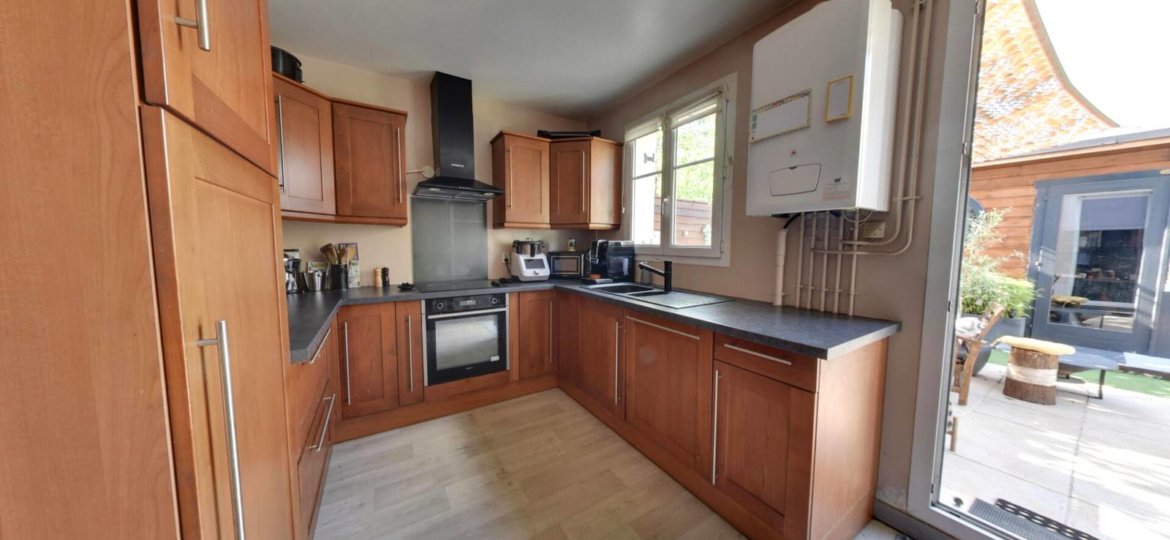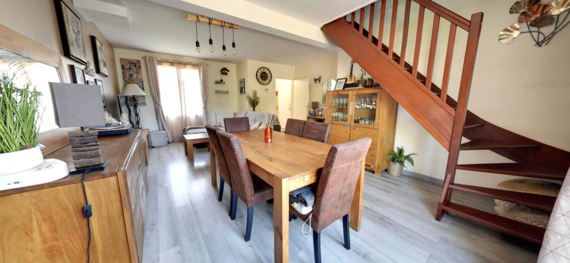 Au rez-de-chaussée : entrée avec placard, WC avec lave-mains, séjour / salle à manger avec lumière traversante, cuisine indépendante meublée et équipée.