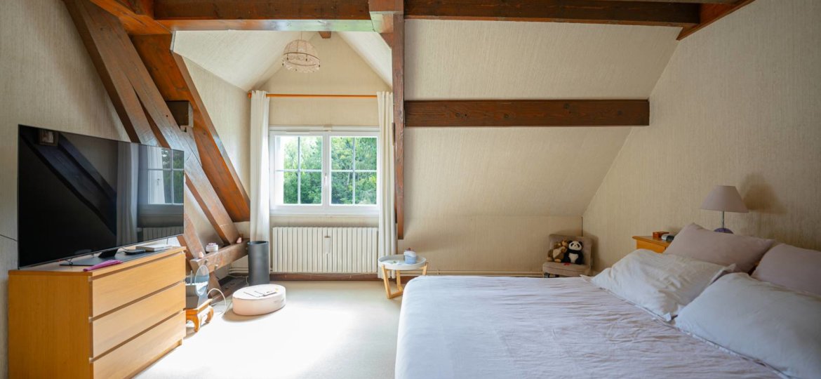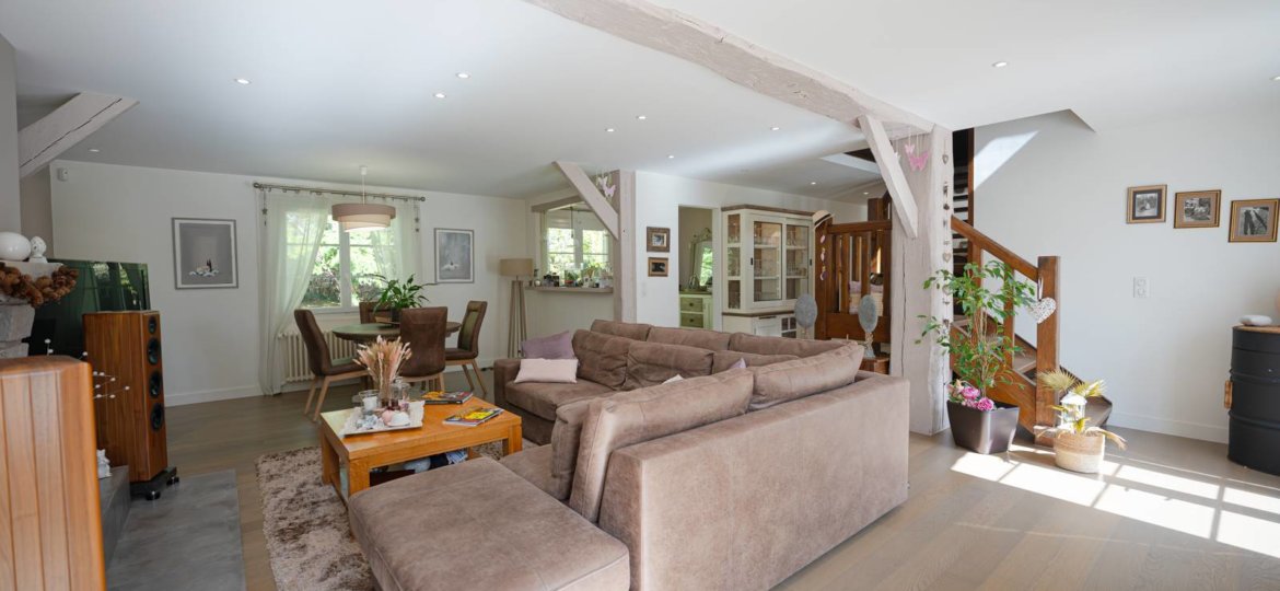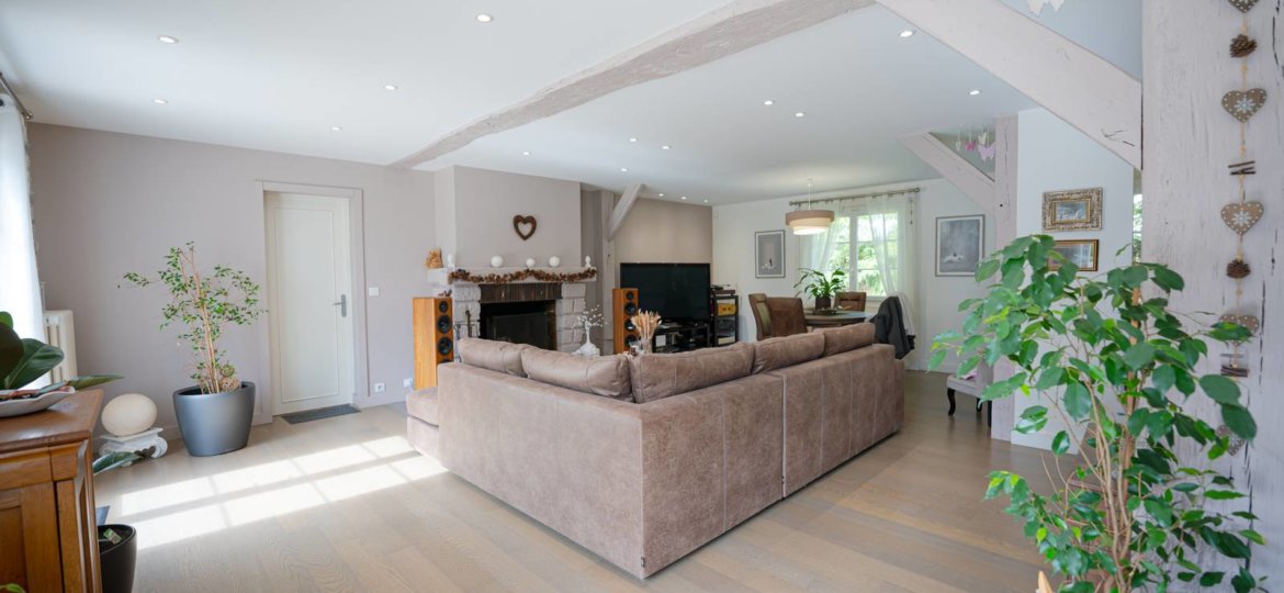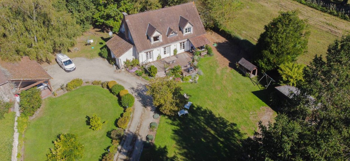 Maison traditionnelle indépendante comprenant au rez de chaussée : séjour salon avec cheminée foyer ouvert d'environ 50m², cuisine indépendante équipée (four, plaque, hotte, lave vaisselle), dégagement, 1 chambre, salle d'eau, wc. A l'étage : palier, 4 chambres, salle de bains, wc. Carport 2 voitures, garage moto, abri de jardin, terrasse couverte. Le tout édifié sur environ 2851m² de terrain avec mare.